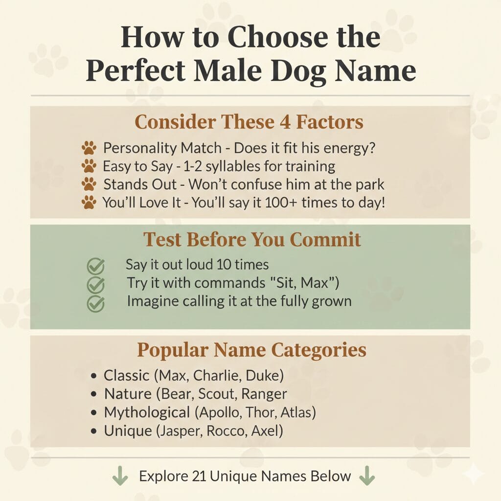 You want something different. Something meaningful. A name that sounds confident when you’re teaching “sit,” feels natural when you’re calling him in from the backyard, and makes you smile every single time you say it. These 21 male dog names give you options for every personality—from strong and classic to quirky and unexpected—so your good boy gets a name that’s as special as he is.