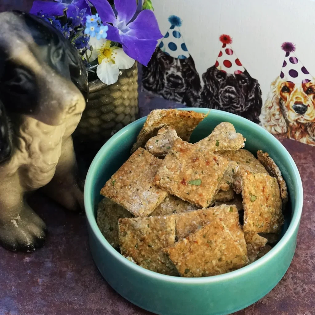 Preheat your oven to 350°F. Mix the dry ingredients first — flour, oats — then add your egg, broth, and olive oil. Fold the parsley, chives, and carrots in last. The dough should feel firm, not sticky. Roll it out to about ¼ inch thick on a floured surface, then cut into squares or use a bone-shaped cutter if you’re feeling extra. Bake 25-30 minutes until edges are crisp and deep gold. Let them cool completely before serving — a warm biscuit can upset sensitive stomachs.