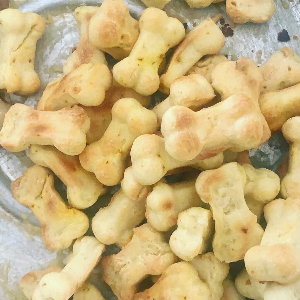 These biscuits are golden-brown, crunchy, and shaped like the classic cartoon bone — 2.5 inches long, cut from a simple rolled dough. The texture is firm enough to keep your pup busy but not so hard it’s scary for their teeth.