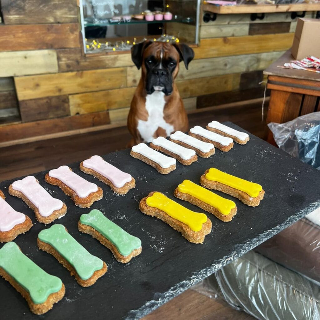 These treats from The Hound Ville are genuinely adorable — bone-shaped biscuits topped with pastel frosting in pink, green, yellow, and white. They look like something off your Pinterest board, honestly.