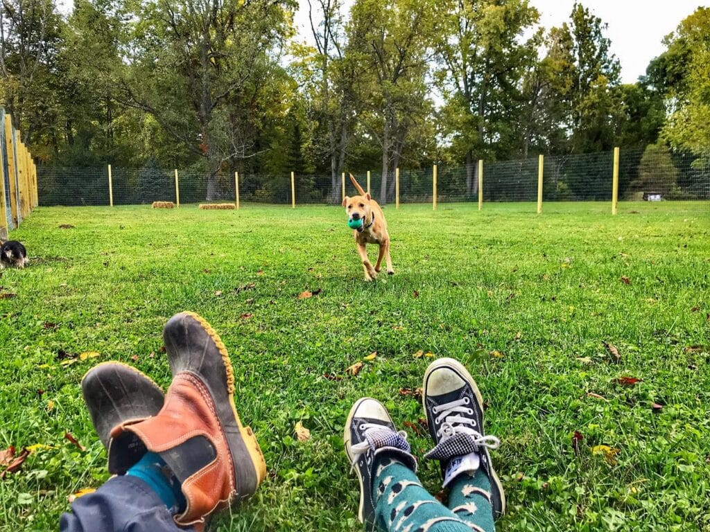 Two people flopped on green grass inside a fenced dog park, letting their fetch-crazy dog run free. The dark mesh fencing with yellow posts keeps everything contained while the trees make it feel like you’re deep in the woods, not a suburban park.