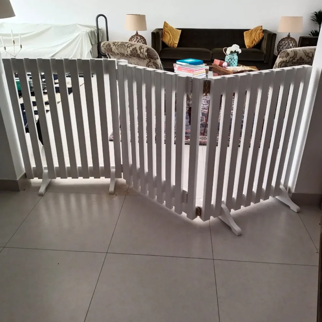 Grab a 3-panel or 4-panel freestanding pet gate in white. Amazon and Chewy both carry them around $60-90. Sand and repaint yours if the finish chips — a quick coat of semi-gloss white keeps it looking fresh.
