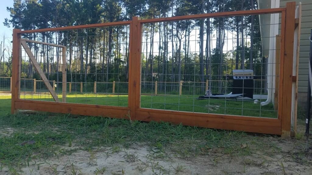 Cedar wood framing with welded wire mesh panels is the move here. The fence in this photo uses 4×4 cedar posts, 2×6 horizontal rails (top and bottom), and wire livestock panels sandwiched inside. The warm honey stain ties everything together without looking too “farm-y.”