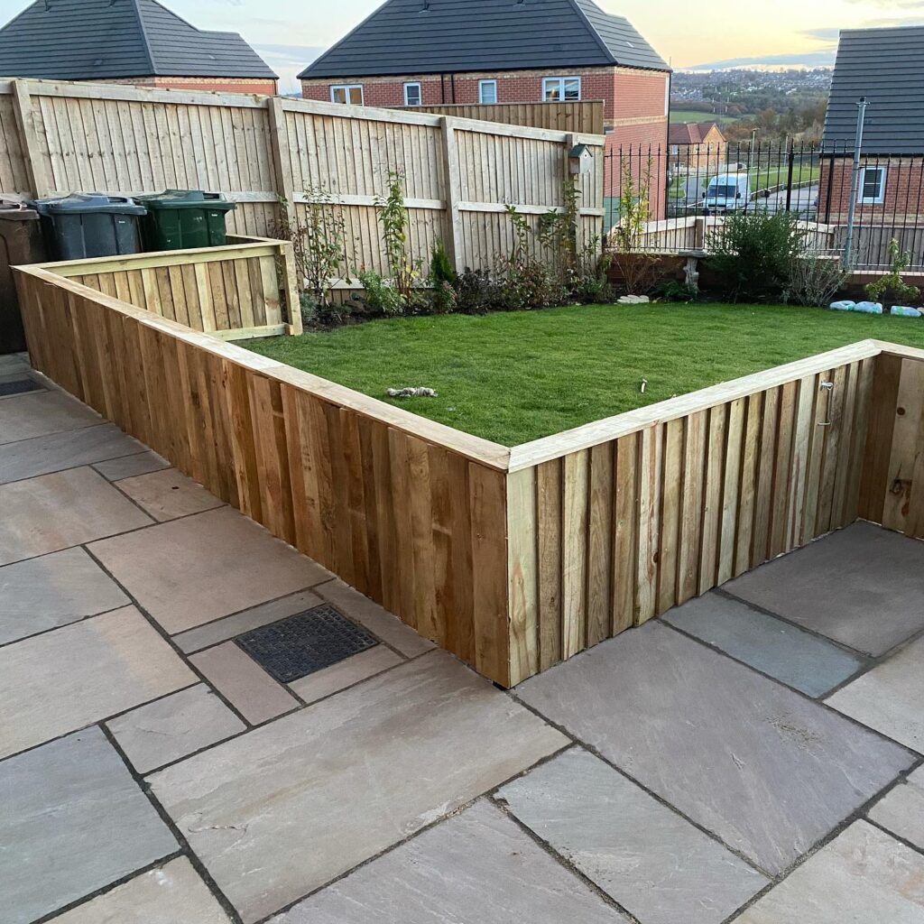 One thing to remember: keep the lawn slightly lower than the timber cap — it stops soil washing onto your patio when it rains.