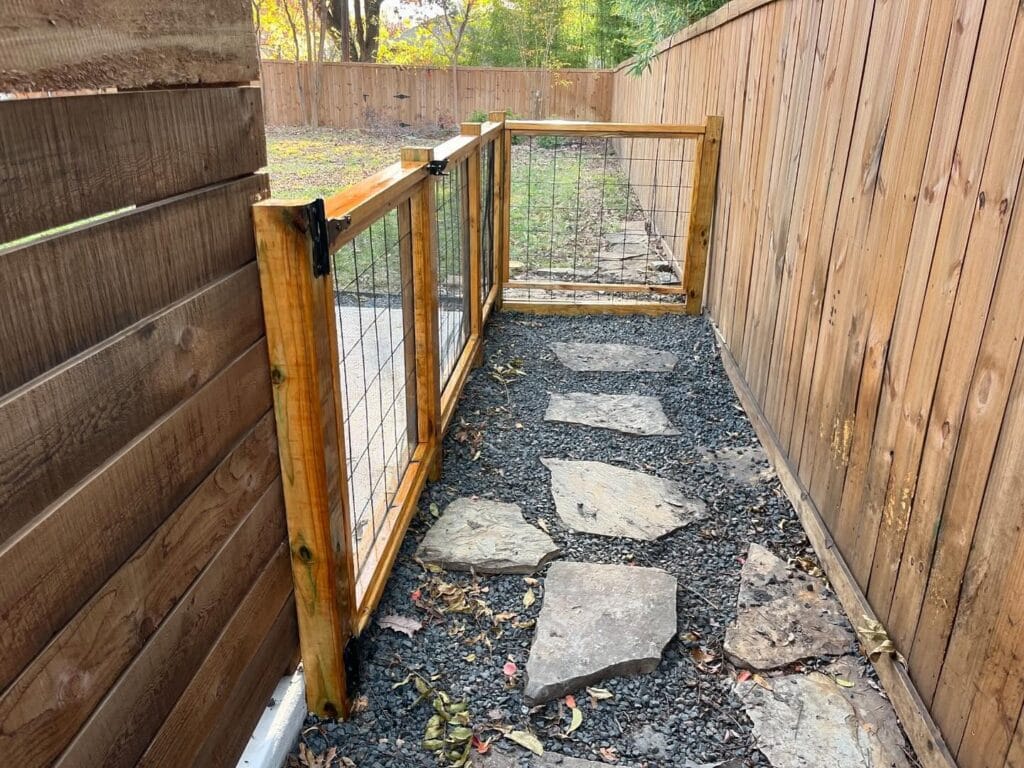 Cedar wood fence panels sandwich a narrow side yard corridor here, and the ground is layered with dark gray decomposed granite gravel topped with irregular flagstone stepping stones. Two hog wire gates with cedar frames and black iron hinges section the path into a contained run. Clean, contained, gorgeous.