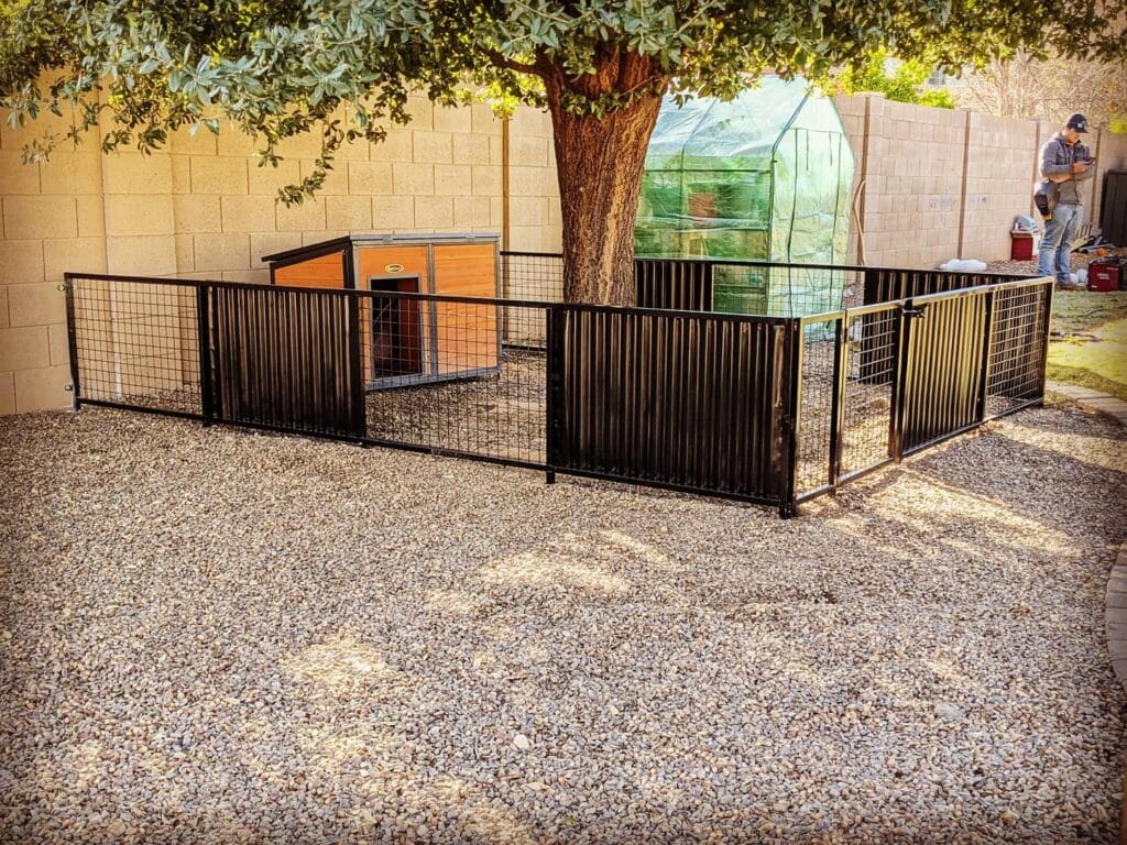 #11: Black Steel Panel Dog Run With Gravel Ground Cover and Built-In Kennel