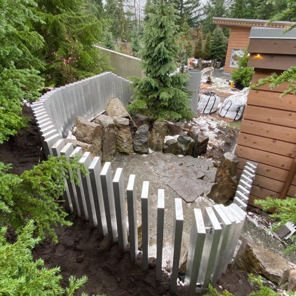 Curved aluminum slat fence panels wrap around a natural boulder garden, creating a defined zone that keeps curious dogs out of the planted areas. The raw grey stone boulders contrast against crisp white metal — it’s giving Pinterest board meets Pacific Northwest woodland. And the evergreen backdrop does all the heavy lifting, so you don’t need much else.