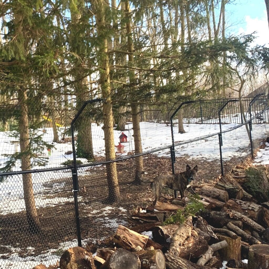This setup is doing something right. A black powder-coated chain-link fence curves through a wooded backyard, creating a dedicated dog run that blends into the trees instead of fighting them. The inward-angled top rail is the real move here — it’s designed so escape artists can’t climb out.