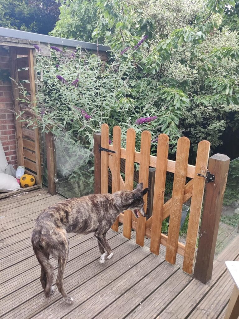 #2: Brindle Dog Barking at a Wooden Picket Gate on a Backyard Deck
