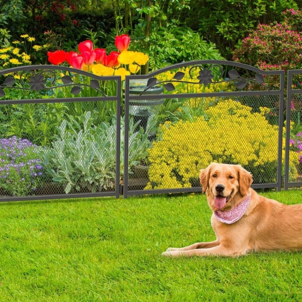 The star here is a decorative animal barrier fence — look for panels around 32 inches tall with mesh openings no wider than 1.5 inches. That gap size keeps golden retriever snouts from pushing through.