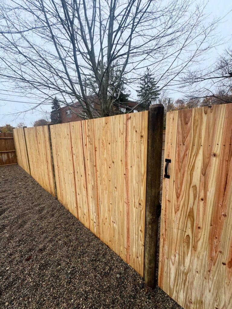 What you’re looking at: a 6-foot cedar privacy fence with pressure-treated dark wood posts, a gravel-lined path, and a black metal gate handle. The whole thing feels sturdy and warm at the same time — like it was always supposed to be there.