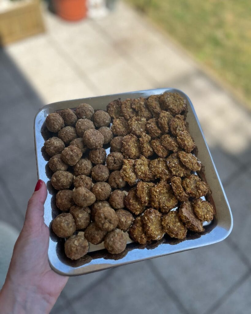Two things on this tray — round beef and oat meatballs on the left, and flatter veggie-herb patties on the right. Both baked, both golden-brown, both absolutely demolished by my dog within seconds.
