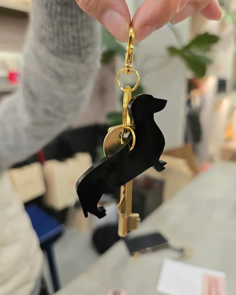 This black acrylic dachshund silhouette paired with a gold lobster clasp and ring hardware is giving me all the heart eyes. The contrast is clean, minimal, and very Pinterest shelf-worthy.