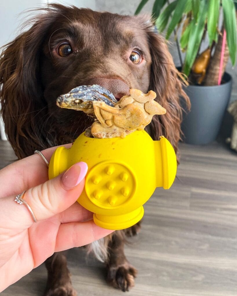 The toy itself is food-grade silicone, firm but flexible, with a textured grip surface and treat-holding opening at the top. The bright yellow color pops against any floor or couch — and yes, it’s Pinterest-worthy even mid-snack session.
