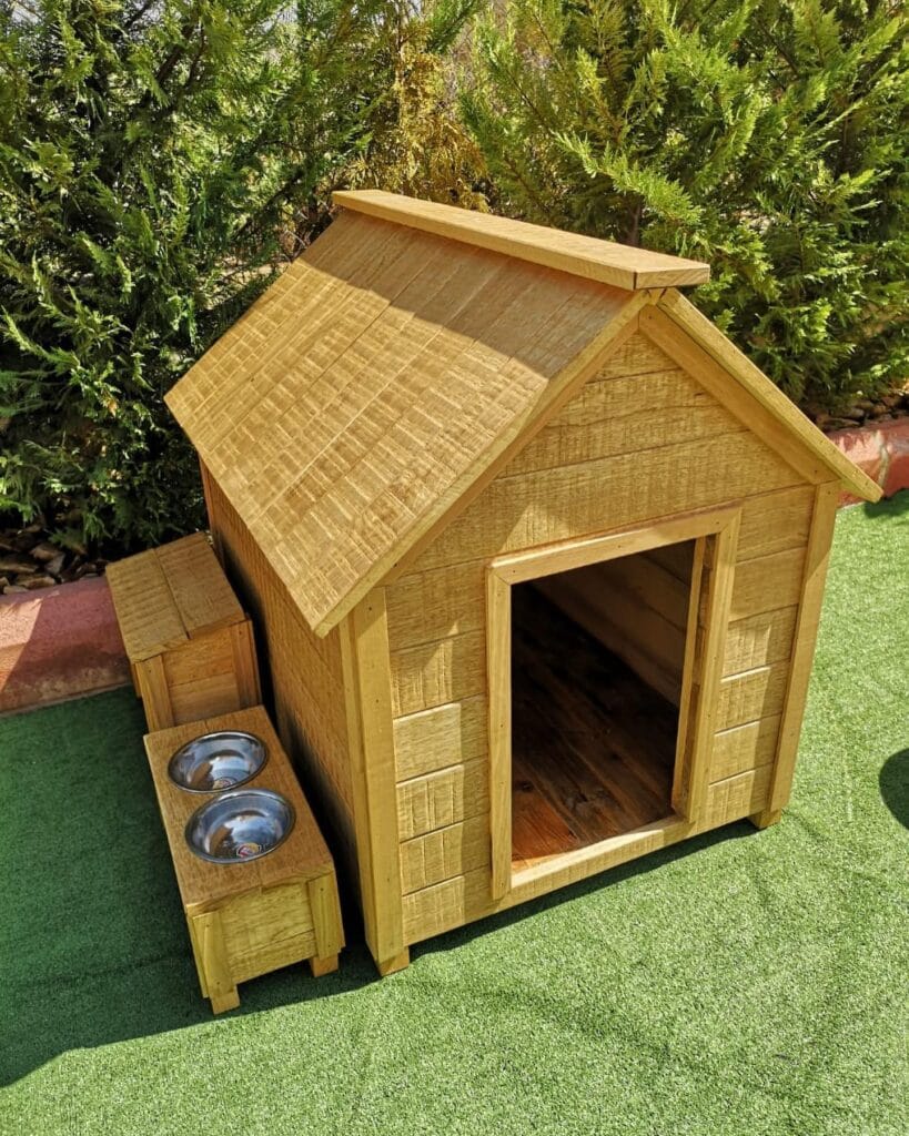 The wood planks are stacked vertically on the walls and laid in a classic shingle pattern on the roof — that contrast is doing a lot of heavy lifting here. And the built-in feeding station on the left side holds two stainless steel bowls, which means food and water live right at the door. No more random bowls tipping over in the grass.
