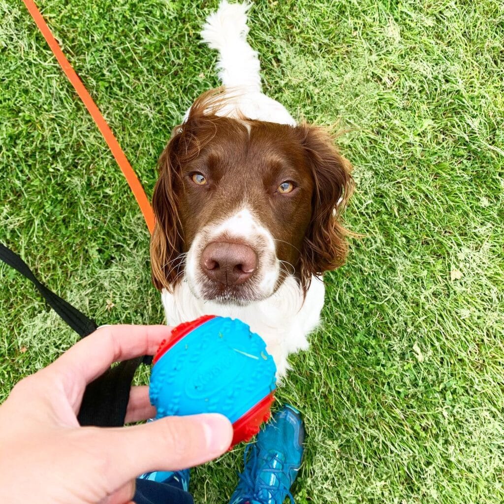 This is a liver-and-white English Springer Spaniel on a leash, holding a blue-and-red rubber fetch ball while looking directly up at the handler. It’s giving major “I want it but I won’t admit it” energy. And honestly? That eye contact is the whole training opportunity.