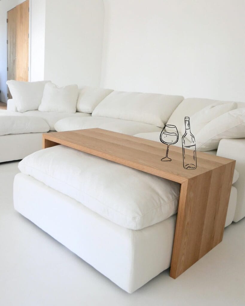 The star here is the C-shaped ottoman tray — basically a flat plank with two side legs that straddle your ottoman. No screws, no tools. You can find these in solid oak or plywood on Etsy, or DIY one with a 60″ x 16″ board and two 14″ side panels.