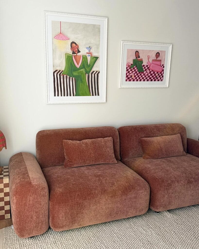 This room gets it exactly right. A terracotta velvet modular sofa anchors the space with chunky, rounded arms that practically beg to be napped on — by you and your dog. Two white ornate frames hold bold figurative art in pink and green, and the whole thing feels like a cocktail party you never want to leave.