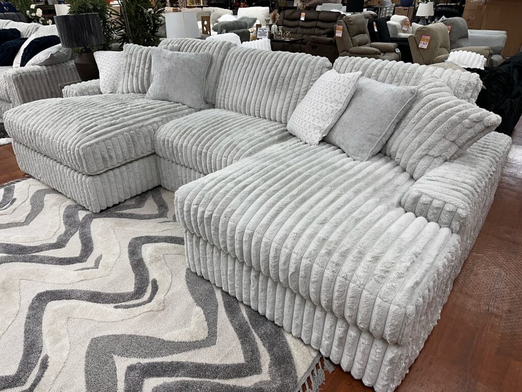 Okay, so picture this. You’re sinking into a light gray ribbed chenille sectional that feels like a giant marshmallow wrapped you up — and your golden retriever immediately claims the chaise end like she paid for it.