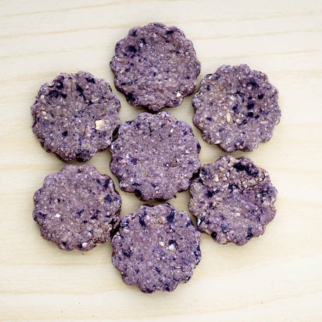 Here’s the pro move: freeze-dry your blueberries first, or buy freeze-dried ones, then crush them into a powder before mixing them into your dough. The flavor concentrates, the texture stays consistent, and your golden’s tummy stays happy.