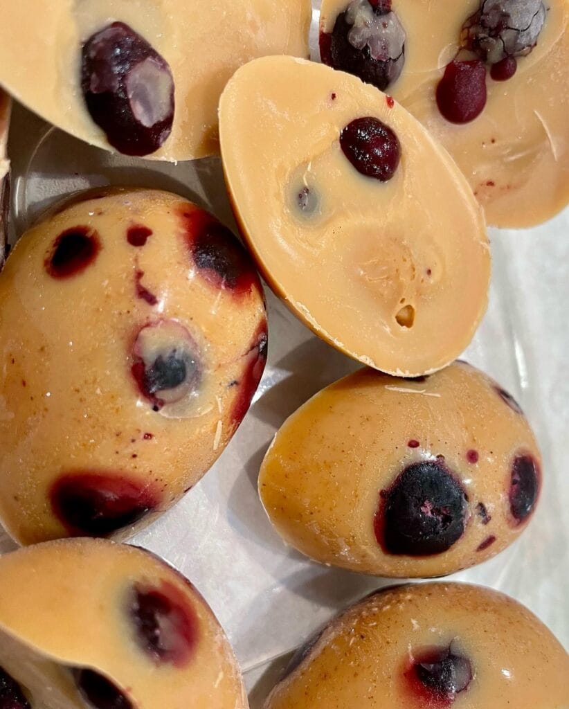 The blueberries sink and bloom as they freeze, which is why yours end up looking exactly like the photo. That’s not luck — it’s just the density doing its thing.