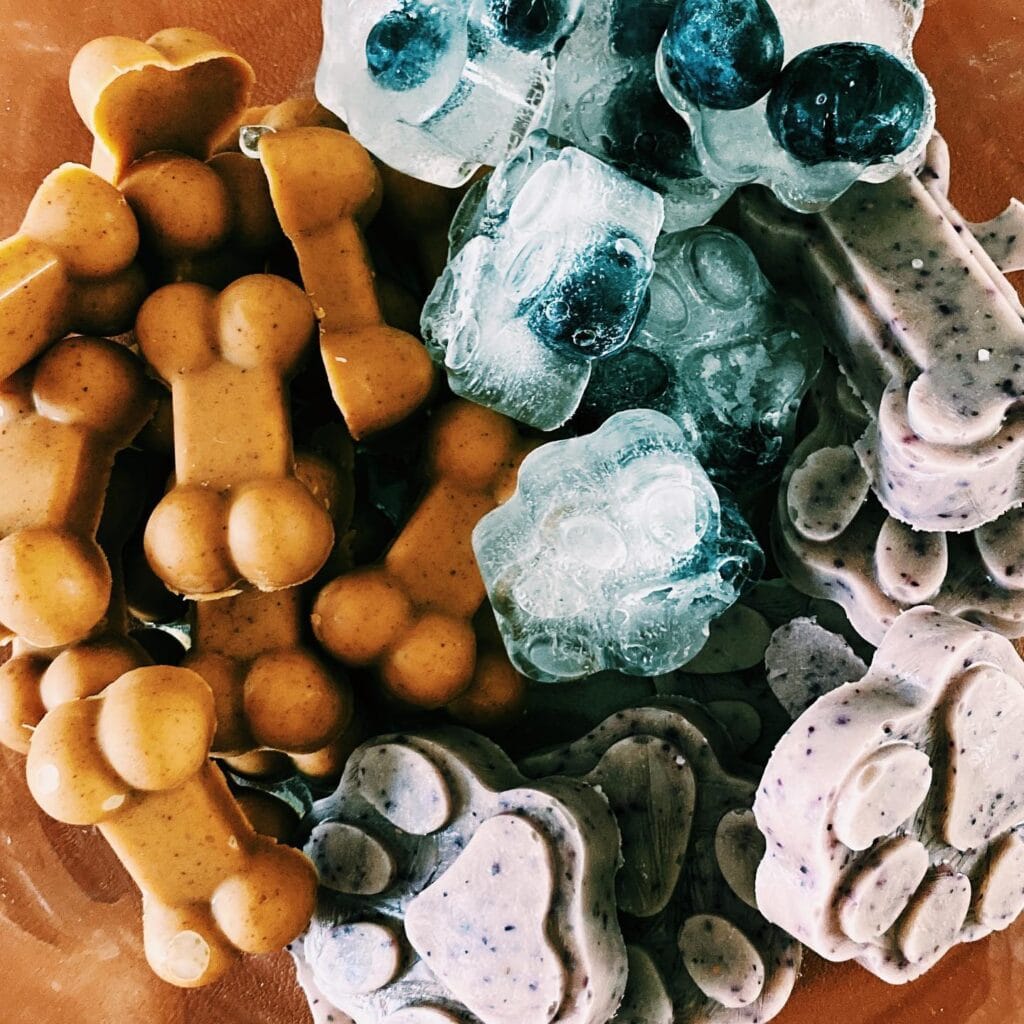 Three flavors, one freezer session — peanut butter bones, blueberry yogurt paws, and straight-up blueberry ice cubes.