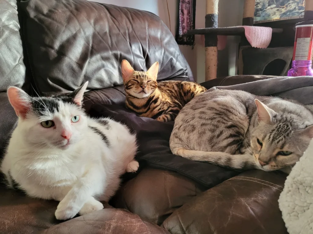 That’s exactly what’s happening in this photo — and honestly? It looks cozy as hell. A dark brown leather sofa acts as the anchor, and three cats (a brown Bengal, a silver tabby, and a black-and-white tuxedo) are just… living their best life across every inch of it. The warm afternoon light hitting them makes the whole setup feel intentional, like a real cat lounge.