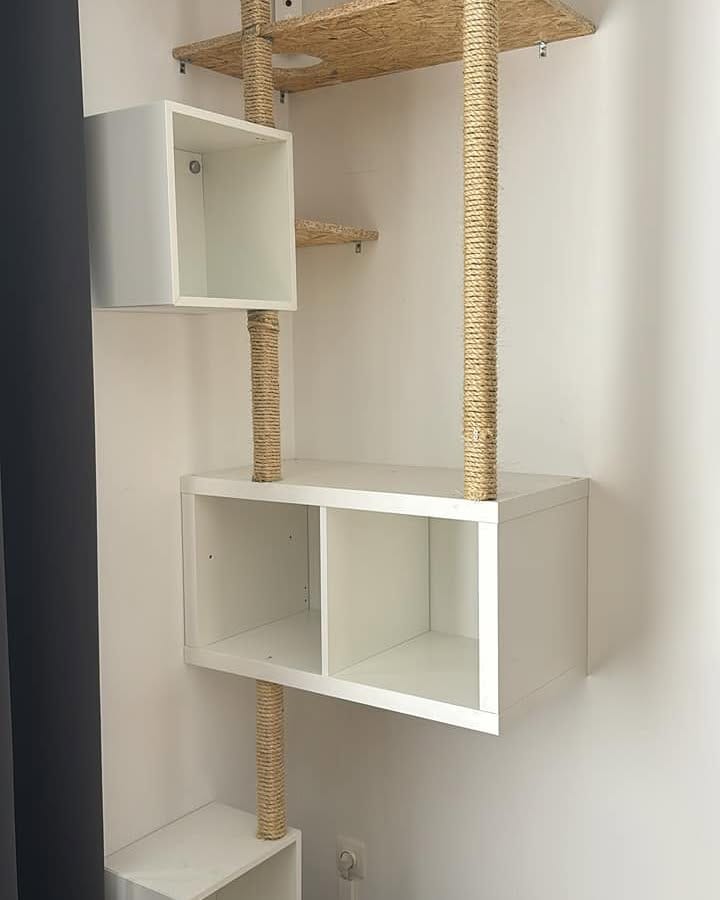 Okay, so you know how your golden retriever has basically claimed every corner of your living room? Your cat deserves that same energy — but make it chic. This setup uses white KALLAX IKEA cube shelves mounted at different heights, connected by sisal rope-wrapped posts that run floor to ceiling. It’s clean, it’s structured, and honestly it looks like it belongs in a Pinterest board you’ve been saving to for years.