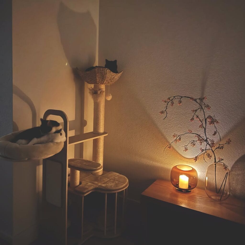 This setup hits different at night. Warm candlelight, a delicate branch arrangement in a glass vase, and two cats completely unbothered in their little kingdom — it’s the kind of corner that makes your whole living room feel intentional. And honestly? Your golden would probably park herself right next to that cat tree and just exist there too.