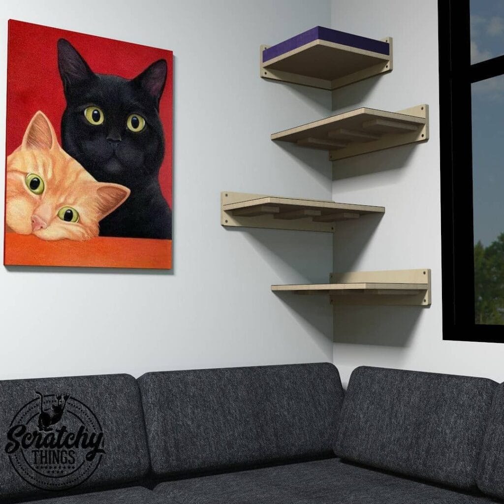Four birch plywood shelves zigzag up the corner wall in a staggered, alternating pattern — each one mounted on metal L-bracket hardware and positioned about 12–14 inches apart vertically so a cat can actually leap between them with ease. The top shelf has a strip of purple carpet padding along the edge, which is such a smart little detail because it gives cats grip and a cozy landing spot without screaming “cat furniture” to every guest who walks in.