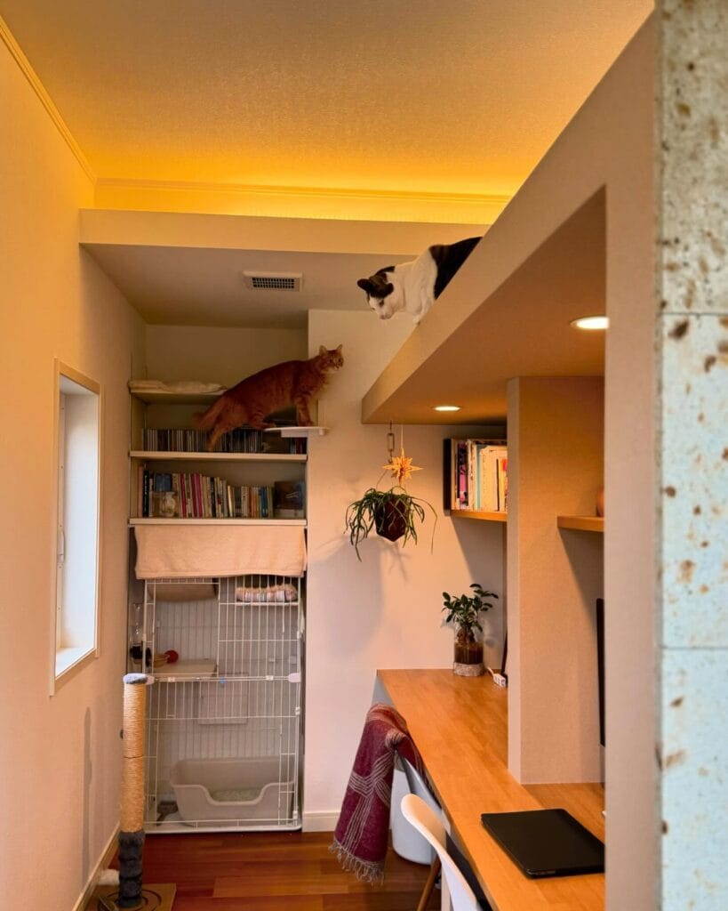 The orange tabby is perched on a floating shelf above a built-in bookcase, and the black-and-white cat is up on a wall-mounted cat walkway — basically a ledge built directly into the wall architecture, about 6–8 inches deep and running near the ceiling line. That’s the star move here.