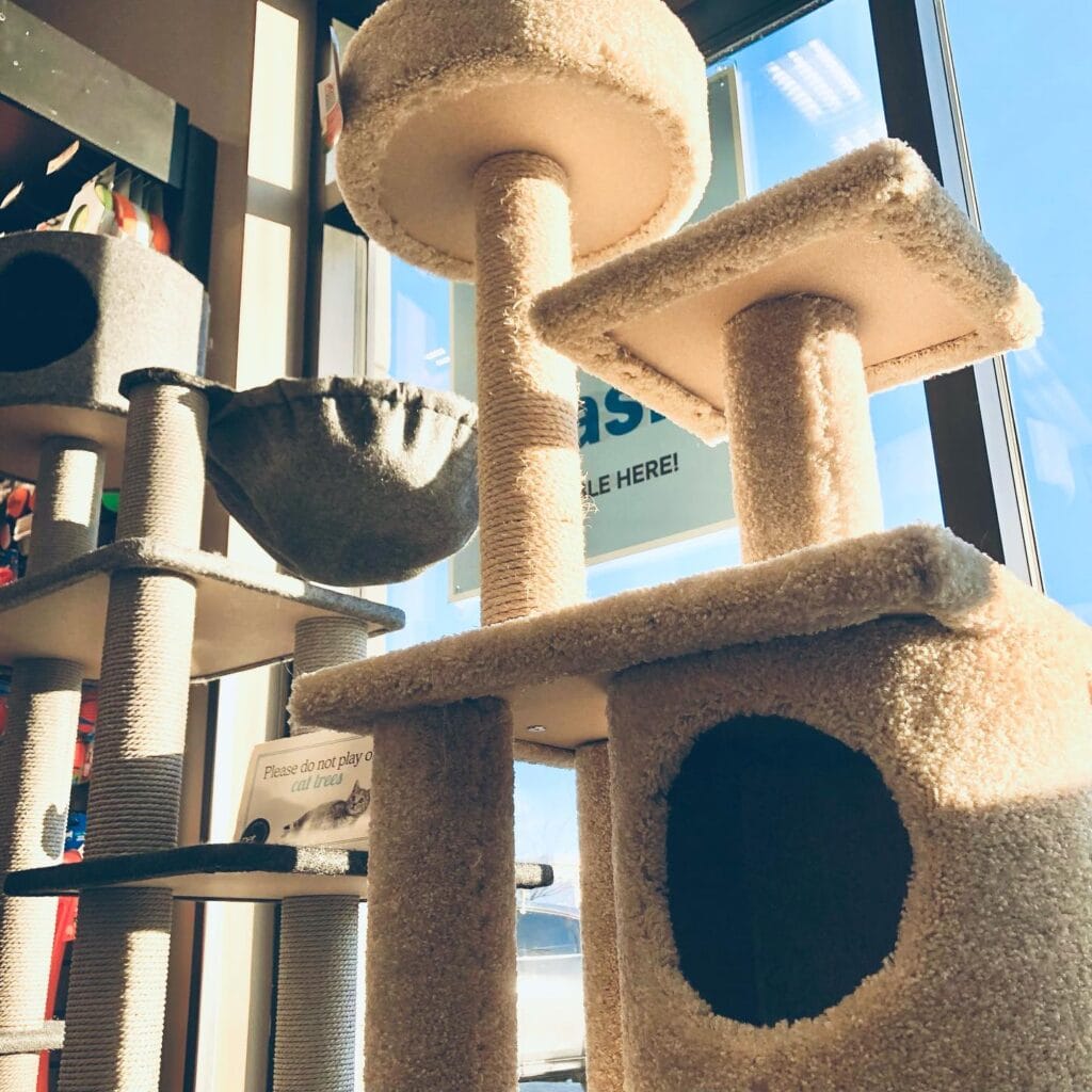 Your golden is obsessed with the sunny spot by the front window — and honestly, your cat deserves that same real estate. This display from Pet Valu shows a tall, carpet-covered cat tree positioned right against a floor-to-ceiling window, and the natural light just floods the whole setup. It’s giving cozy, purposeful, and surprisingly Pinterest-worthy.