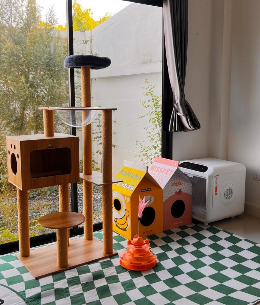 The star of the show is a multi-level wooden cat tree — we’re talking natural sisal-wrapped posts, a round felt perch at the top, a clear acrylic bubble pod on the middle platform, and a built-in wooden hideaway cube with circular cutouts at the base. The whole thing sits on a green and white checkered floor mat that ties the corner together without trying too hard.