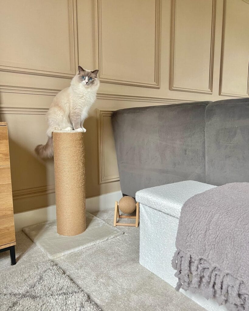 Paired with it is a small wooden-framed sisal ball roller toy sitting on the floor nearby. It’s a natural wood and rope combo that blends right into the neutral palette instead of screaming “cat stuff lives here.”
