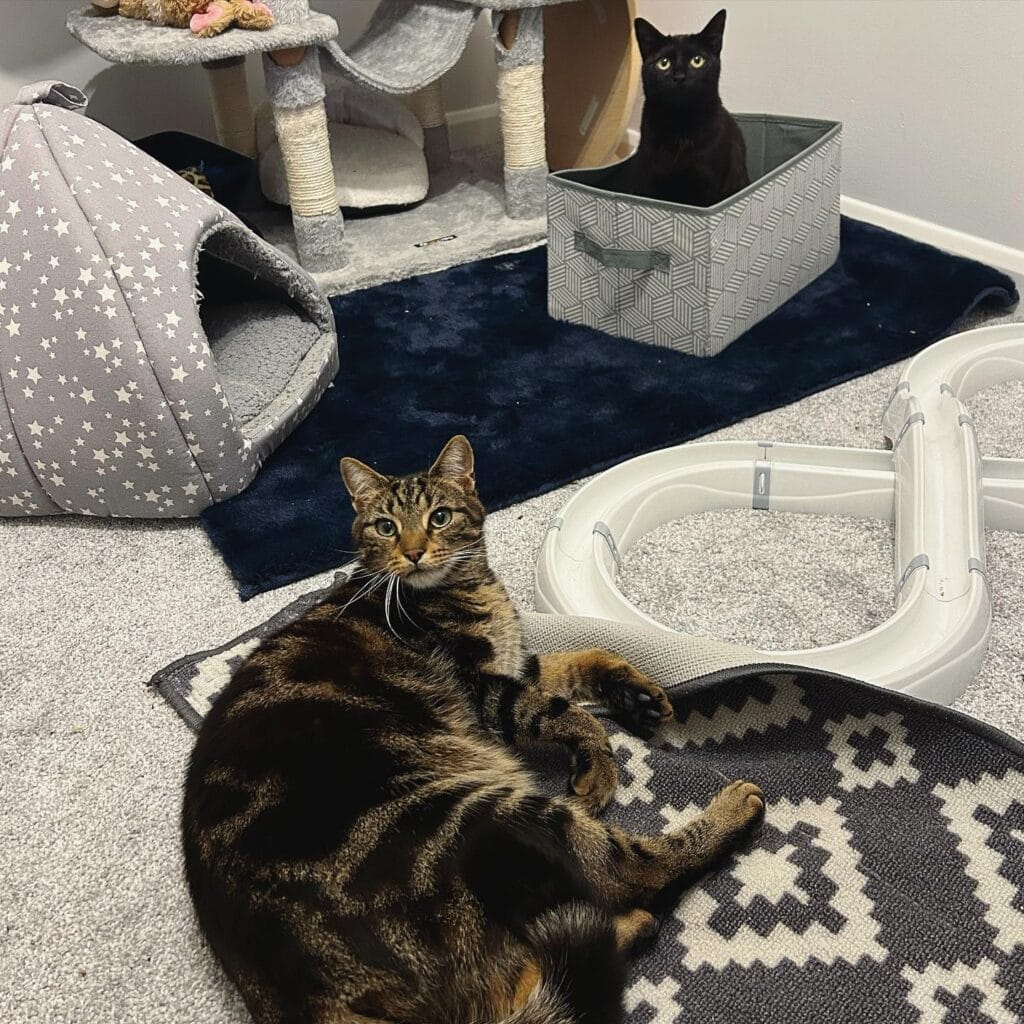 The centerpiece here is a multi-level gray cat tree with sisal-wrapped posts — the kind cats actually use because the texture grips their claws. Pair it with a gray star-print cat igloo bed (the collapsible kind with a plush interior) placed right next to it, so shy cats have a hiding option. That geometric patterned storage bin sitting on the navy mat? It’s not just decor — it holds toys, and apparently one black cat.