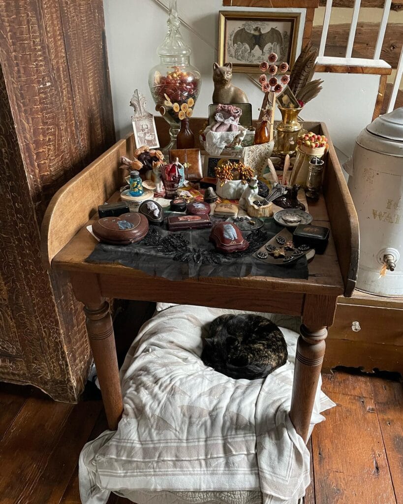 Okay, this one stopped me mid-scroll and I immediately thought of you. You know how you’re always saying your space needs more personality? Well, picture this but make it cozy for a cat — a worn oak butler’s tray table covered in antique trinkets, a big glass apothecary jar, little ceramic cat figurines, and then right underneath, your cat just… curled up in a basket like she owns the whole vibe. Because she does.