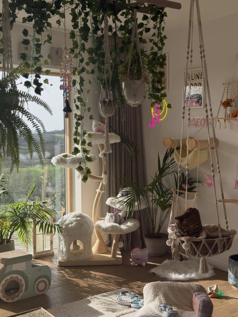Okay, so picture this — you walk into a room and it literally looks like a Pinterest board came to life, except it’s entirely for the cats. Trailing ivy cascades from a ceiling-mounted wooden rod, macramé hangers hold terracotta pots at every height, and a chunky sisal-wrapped cat tree anchors the whole space near the window. My cousin did something similar in her spare bedroom and honestly, I was a little jealous — and I don’t even have a cat.
