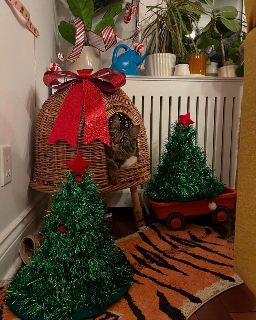 Okay, so you know how your golden always gravitates to that one corner of the house and just… owns it? Cats are the exact same way. This little setup gave me full heart-eyes the second I saw it — a wicker dome cat bed dressed up with a glittery red bow, flanked by two tinsel Christmas trees, sitting on a tiger-print orange rug. It’s Pinterest, but make it lived-in.