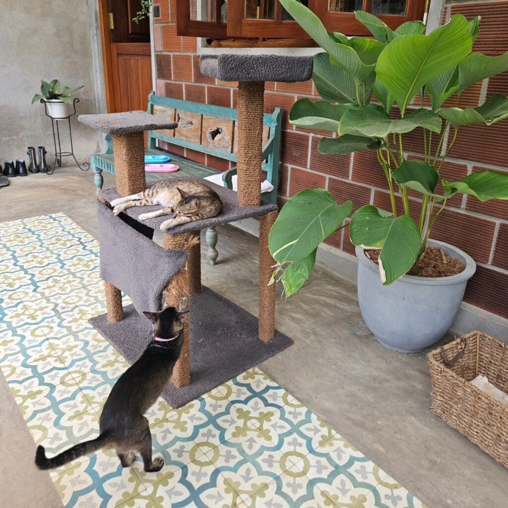 Place the tower near a wall or bench so cats feel anchored, not exposed. That dark cat hanging at the bottom? She’s wearing a pink breakaway collar, which is a must for any outdoor cat space.