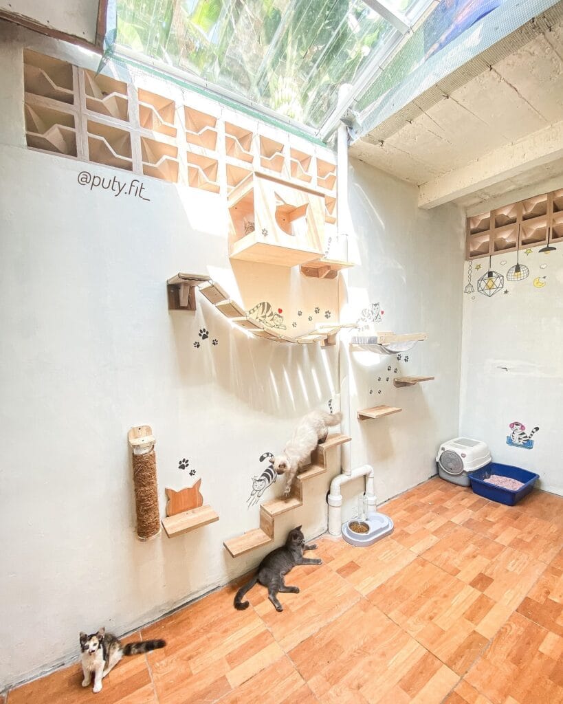 The heart of this setup is a wall-mounted cat highway made from solid wood shelves, stepped wooden staircases, and a rope hammock platform — all anchored at different heights to create a climbing route from floor to skylight. At the base, there’s a sisal-wrapped scratching post with a small shelf bracket, and up top, wooden box condos with cutout entryways give cats a private perch near the ceiling. The floor stays clean and open — just terracotta-tone vinyl tile and a gravity-fed water and food station tucked against the wall.