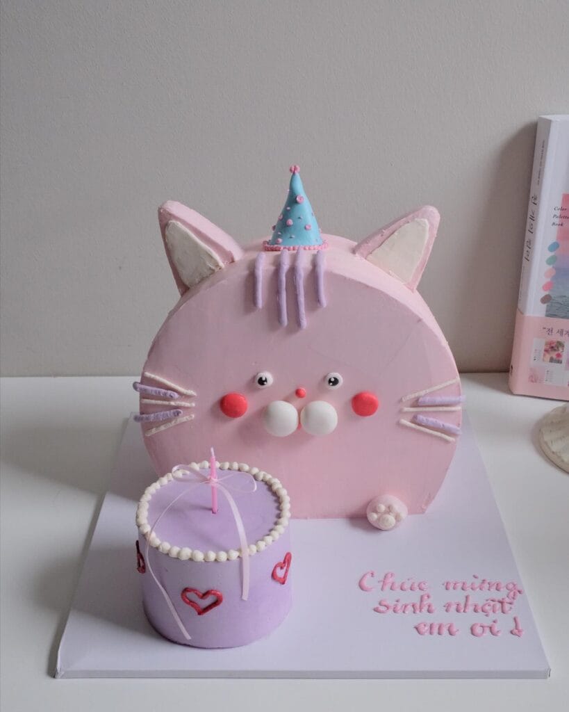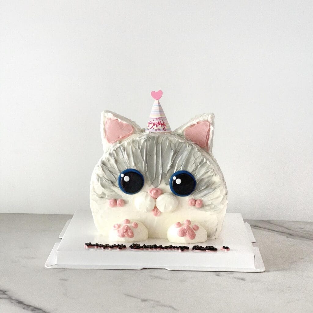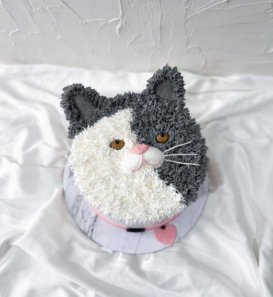 Okay so I know you’re used to planning adorable golden retriever birthday setups, but hear me out — this cat birthday cake just broke my brain a little. It’s a split-face design, half white and half gray, built to look like a fluffy tuxedo-style cat with the most expressive little amber eyes. The pink heart charm detail at the bottom? Chef’s kiss.