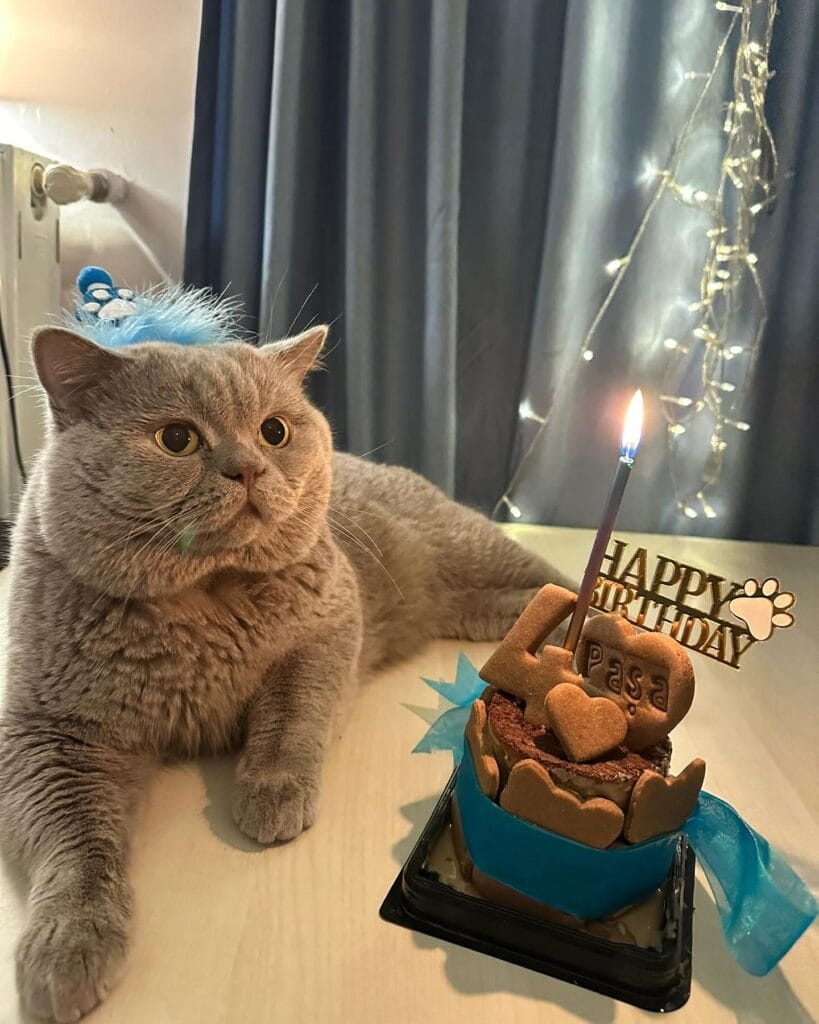 The setup here is doing so much heavy lifting too. Blue curtains in the background, warm fairy lights draped on the side — it looks like someone actually styled this shoot. And then there’s Paşa himself, a lilac British Shorthair, wearing a tiny blue feather birthday hat, looking at that candle like it personally offended him. The photo tells a whole story.