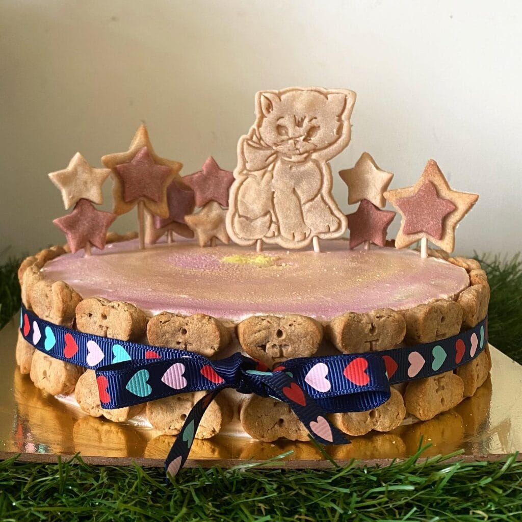 To pull this off, you’ll need cat-treat biscuits (the round kind — Temptations or similar work great), a spring-form pan to shape the base, and pink-tinted cream cheese or yogurt frosting as the “icing.” The star and kitten toppers are made from homemade shortcrust dough stamped with cookie cutters and a detail stamp, then brushed with rose gold luster dust after baking.