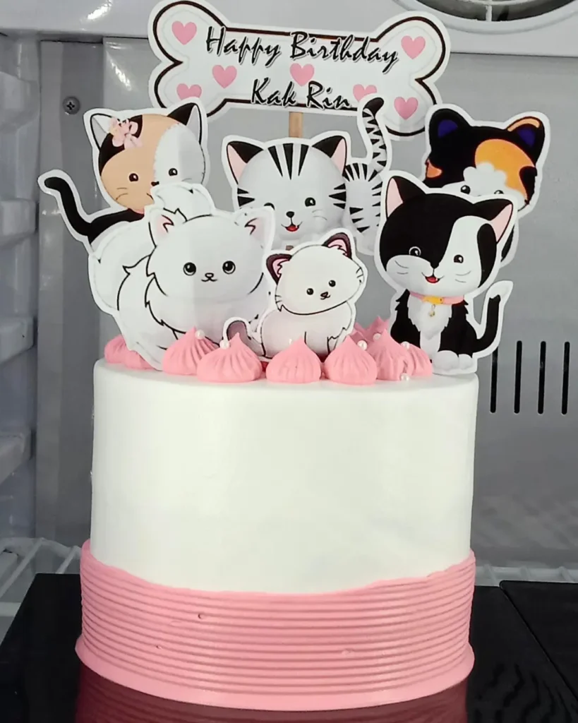 Okay so you know that feeling when you see something so sweet it physically hurts? That’s exactly what happened when I stumbled on this cake. It’s a white and pink ombre buttercream cake topped with kawaii-style cartoon cat cutouts and a bone-shaped “Happy Birthday Kak Rin” topper — and honestly, it’s giving everything.