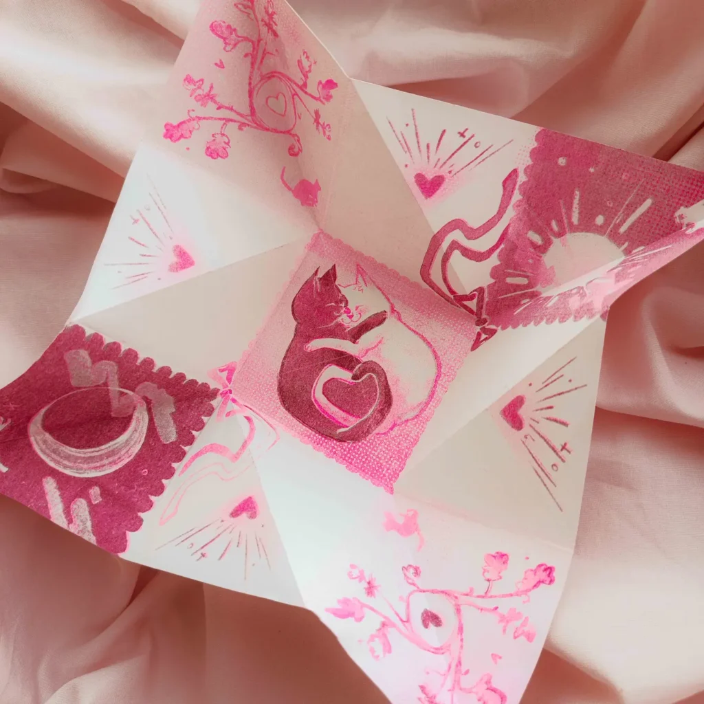 This card is a paper fortune teller — yes, like the ones we folded in fifth grade — but printed on translucent vellum paper with deep magenta and blush pink risograph-style illustrations. Every flap hides a different design: a curled-up tabby cat forming a heart with its tail, a steaming mug, a glowing heart with sunburst lines, and cherry blossom vines. The center square features the most detailed illustration — two cats facing each other, their bodies creating a soft heart silhouette.