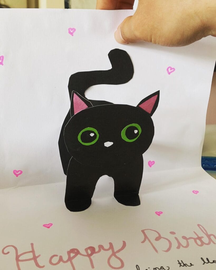 Okay, so you know that feeling when you open a birthday card and it’s just a printed “Happy Birthday” with zero personality? Yeah, this is the total opposite of that. This handmade pop-up card features a black paper cat with green marker eyes and pink inner ears, cut and folded so the kitty literally stands up off the page when you open it.