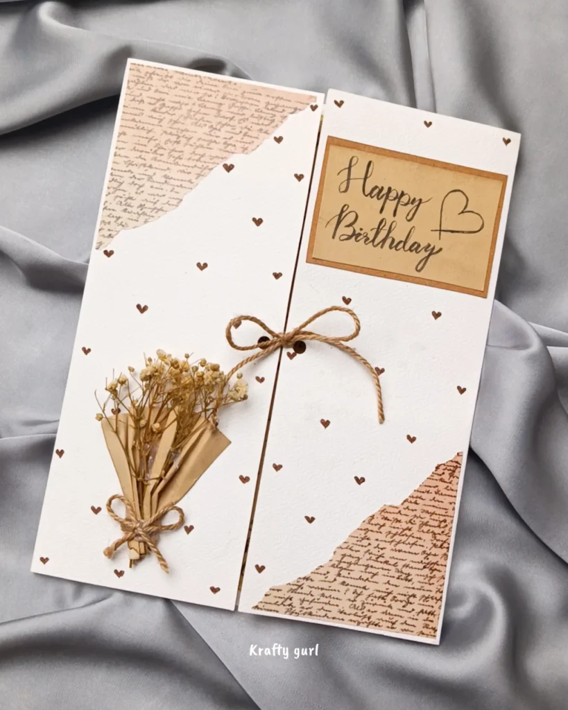 This handmade birthday card has a gatefold-style design made from white cardstock scattered with tiny brown heart stamps. The corners are layered with vintage script patterned paper in warm kraft tones, giving it that aged, love-letter energy that just feels different from anything you’d grab off a rack.