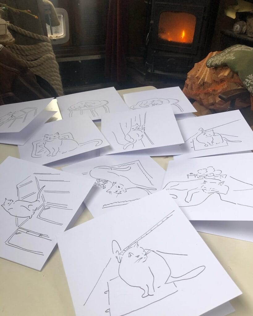 Okay so these stop me every time I scroll past them. Someone sat down by a wood-burning stove — you can literally see the fire glowing in the background — and sketched out this whole collection of cat cards by hand. Each one captures a different cat moment: one climbing curtains, one sprawled on a chair, one just being dramatic on a table. The line art is loose and confident, drawn in black ink on white folded card stock, and the whole set has this cozy, lived-in energy that feels nothing like a store-bought card.