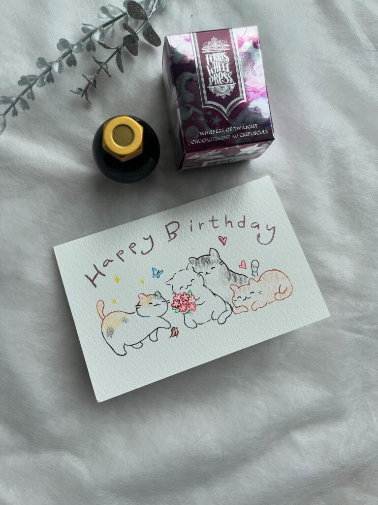 Okay, so picture this — you finally find a birthday card that doesn’t look like it came from the drugstore checkout line. This one stopped me completely in my tracks. It’s a hand-illustrated card featuring four chubby, round little cats drawn in the cutest chibi style, one holding a tiny bouquet of pink flowers, another curled up napping, and little hearts and a blue butterfly floating above them. The “Happy Birthday” lettering arcs across the top in what looks like Ferris Wheel Press “Whispers of Twilight” fountain pen ink — this deep, moody burgundy-purple that shades beautifully on textured paper.