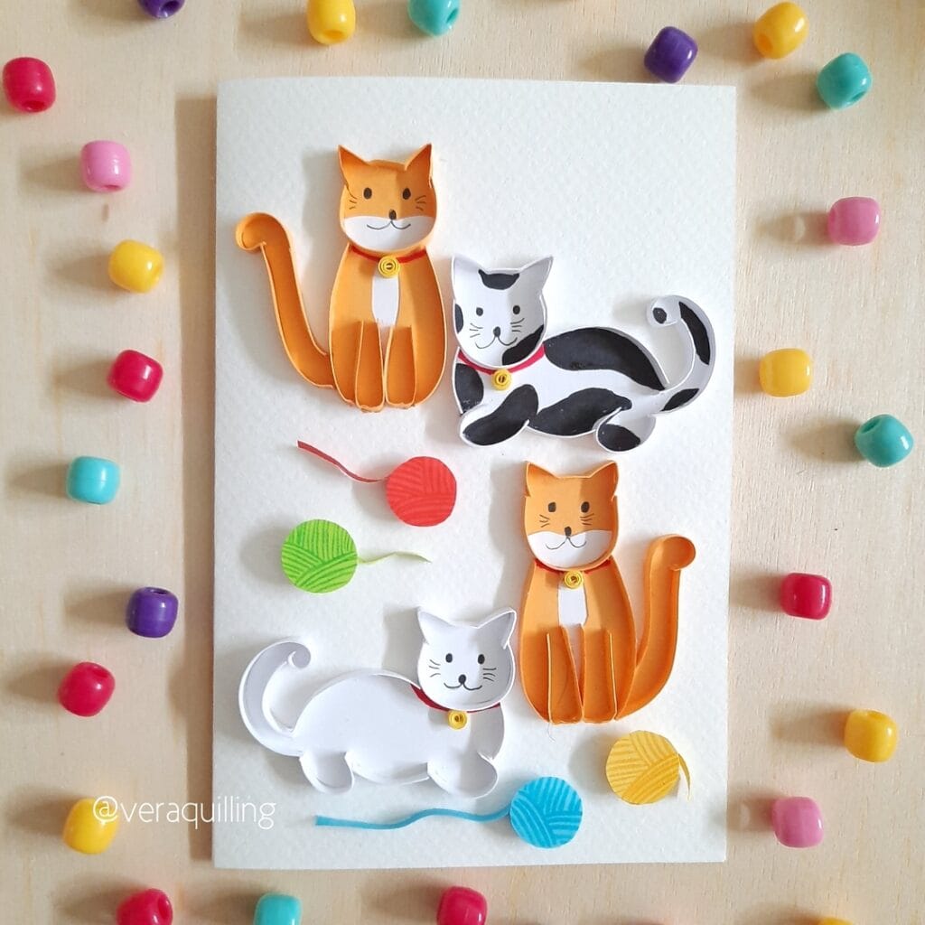 #14: Paper Quilling Cat Birthday Card With Four Playful Cats and Yarn Balls